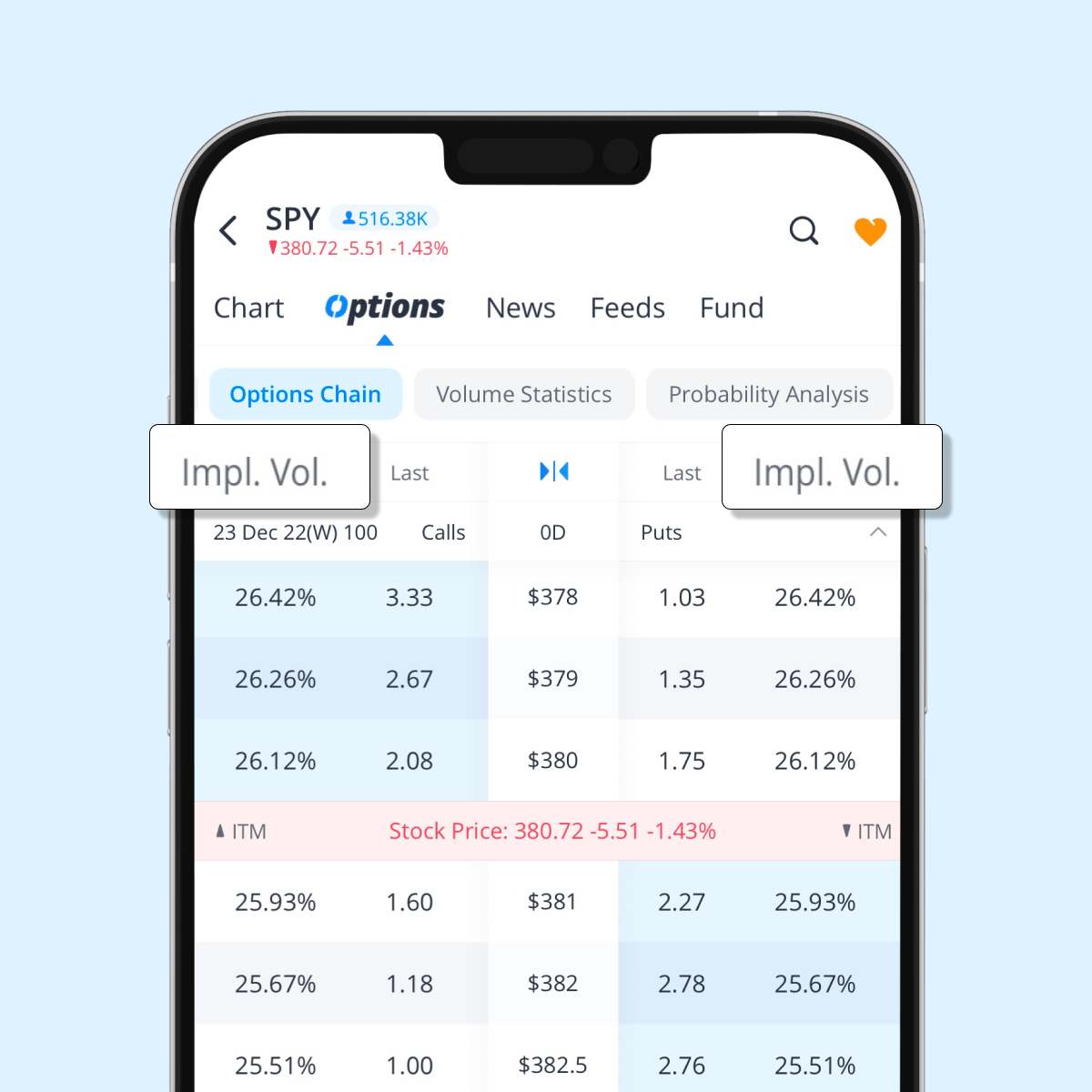 和其他證券一樣,期權合約的價格也是由市場供求所決定的,因此隱含波動率代表市場在某段時間內對於股票未來波動性的共識。在期權鏈上,您可以查看每個期權的隱含波動率數據。