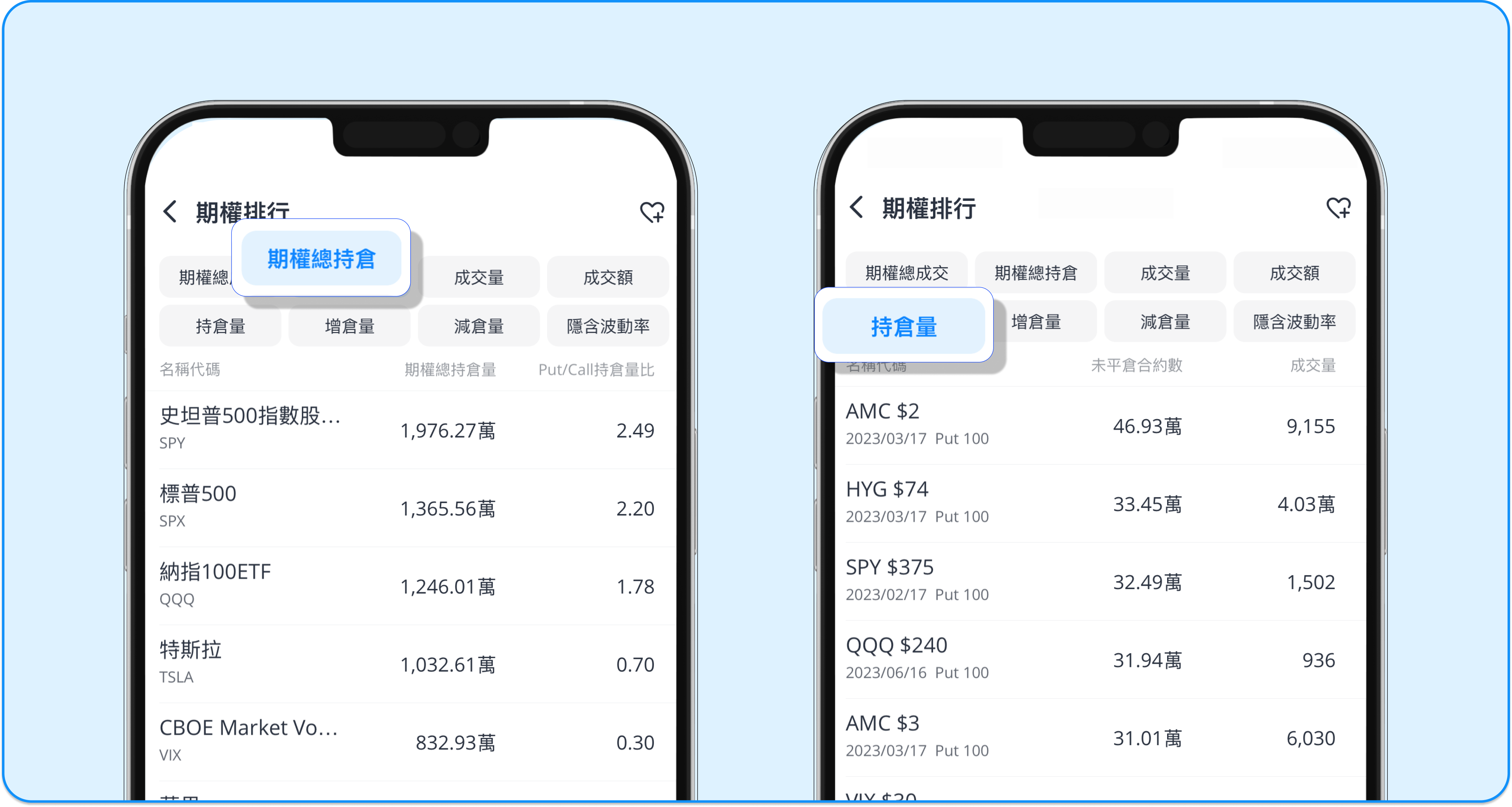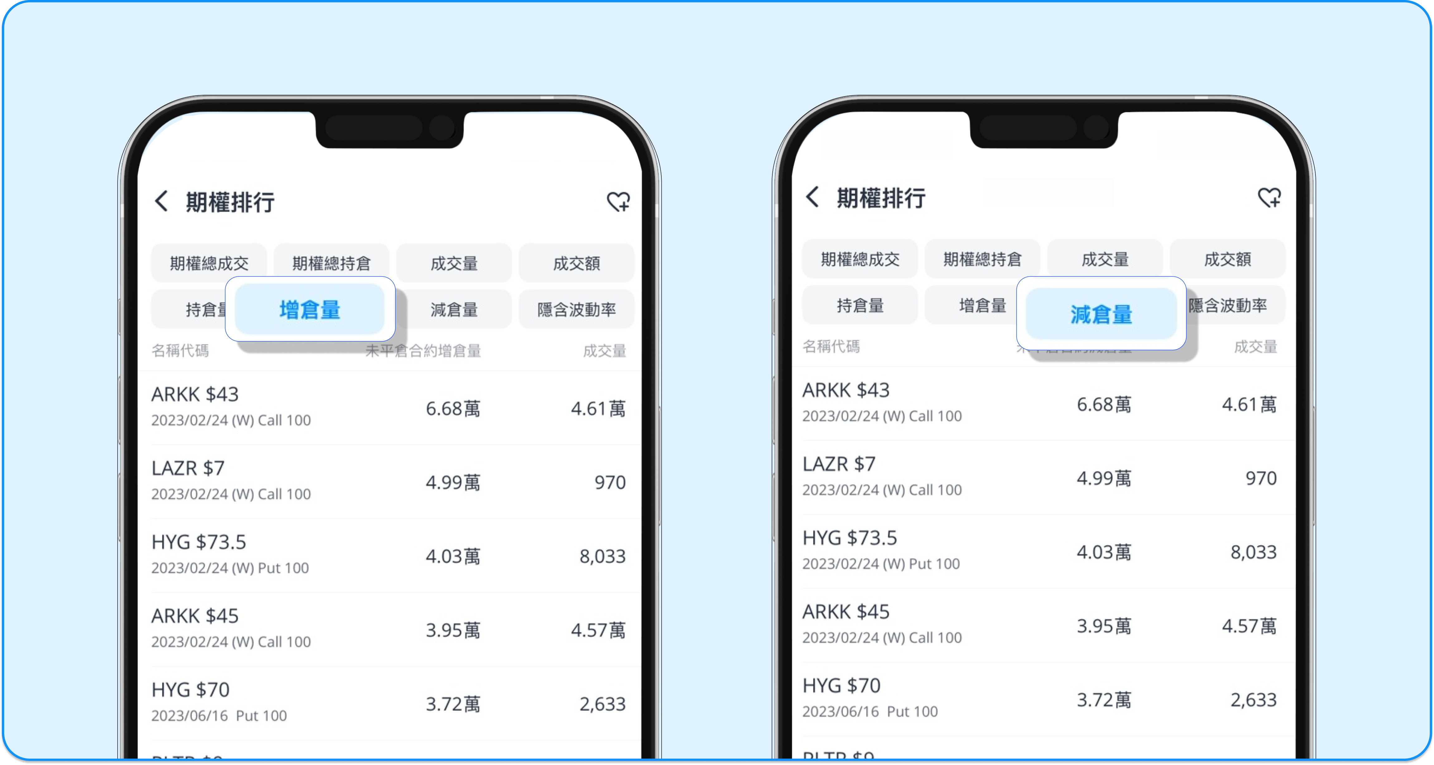 為方便投資者交易,微牛提供兩種榜單,根據未平倉合約從高到低進行排名。