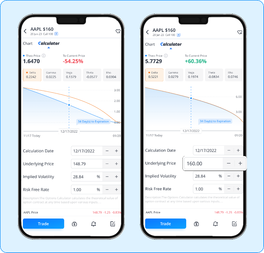在期權鏈界面,連續點擊兩下合約,即可進入期權計算器。根據期權計算器所示,James可以看到他的價外(out of the money)看漲期權的理論值會隨著臨近到期日,逐漸趨於零(藍線表示期權合約的理論價值)。藍線向下傾斜,說明期權由於時間衰減效應而發生貶值。通過使用期權計算器,James會知道,在股價沒有變動的情況下,經過30天后,他可能會失去幾乎一半的原始本金。