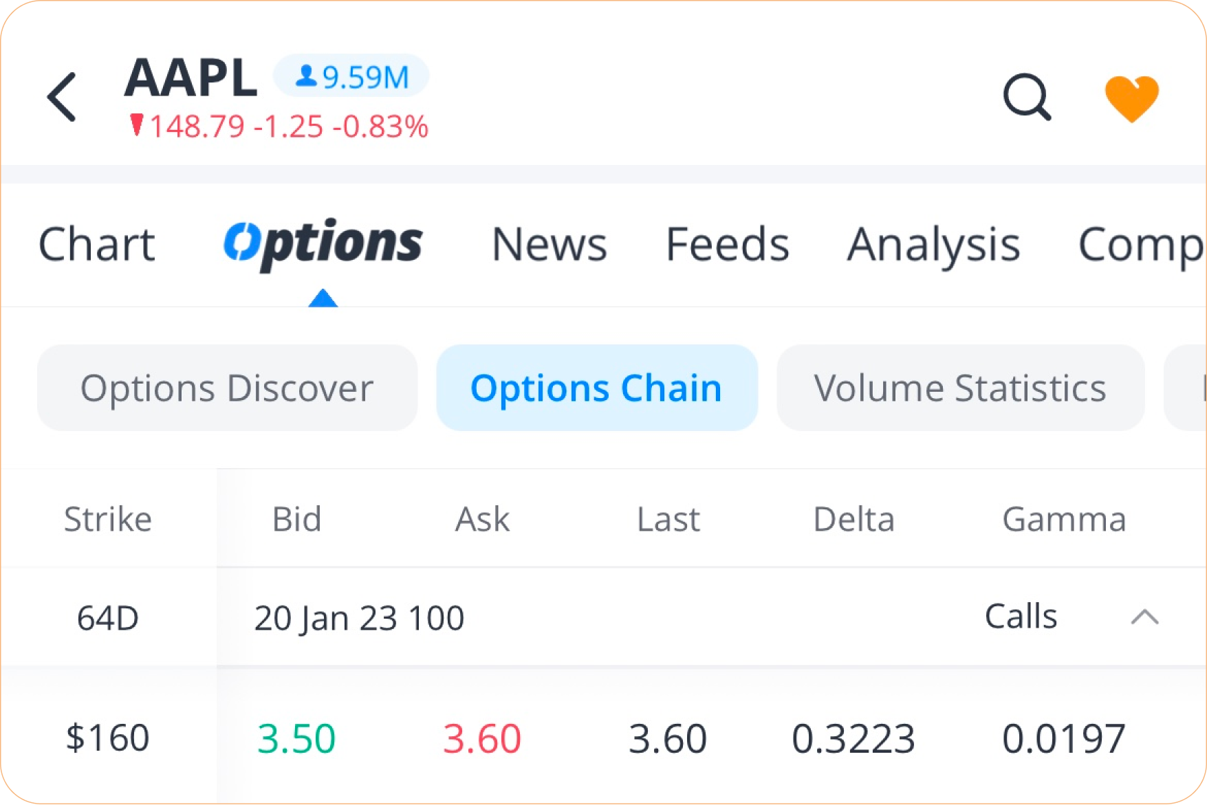 假設James看好蘋果公司(AAPL)的股價,目前股價為148.79美元。他預計AAPL將在下個月上漲至160美元。於是他決定建立一個長倉看漲期權倉位,期望從股價上漲中獲利。