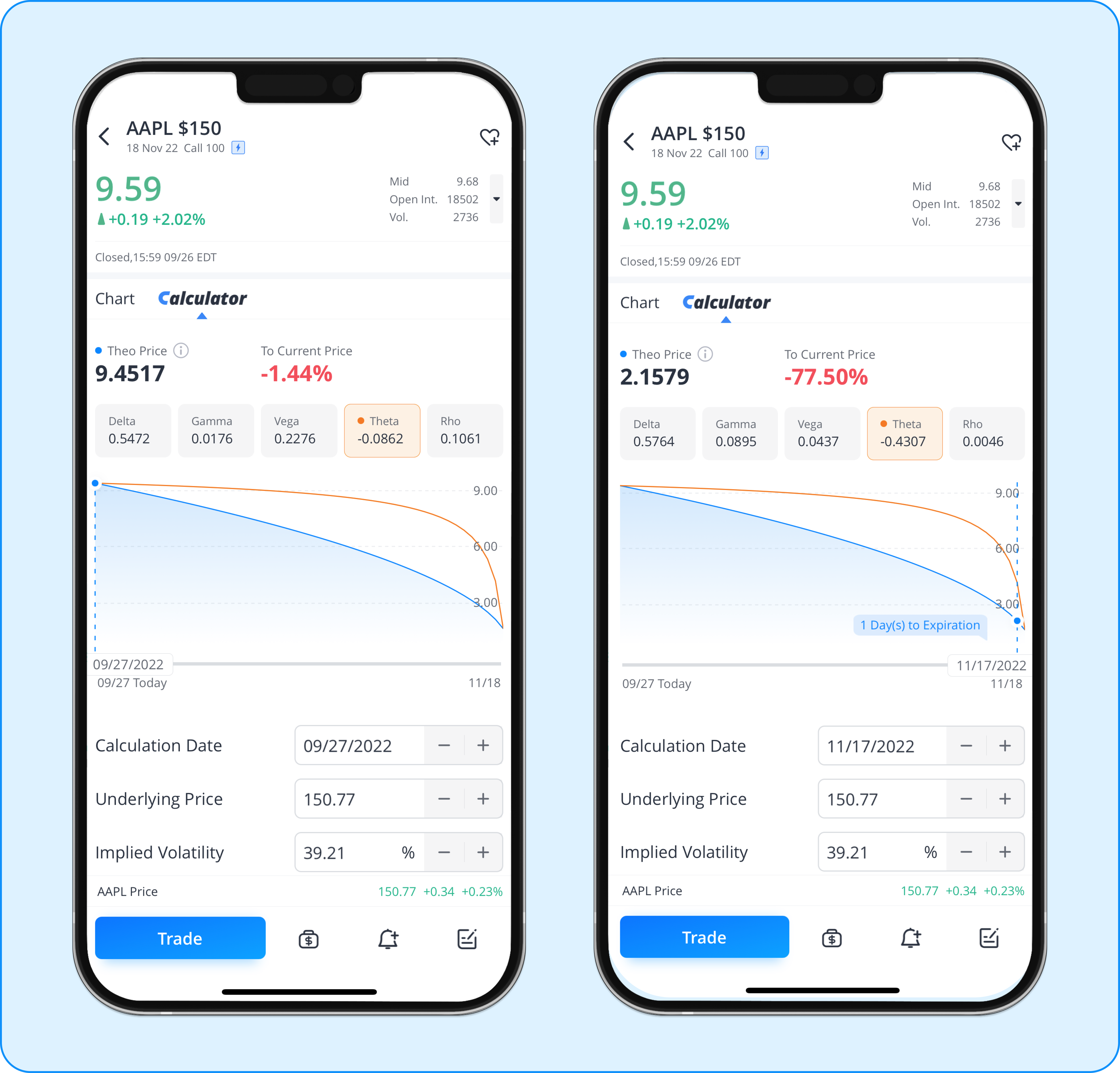 示例:AAPL公司12月18日到期且執行價格為$150的看漲期權,目前處於平值(ATM)狀態,距離到期還有52日。